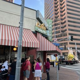 Well I don't know about the rest of you, but I love this joint! It's like a time travel trip back to pre war LA. The only thing missing is the cigarette smoke. They feature a very limited breakfast menu. Eggs, pancakes or french toast, in combinations or ala cart. Served with crispy, crispy, crispy hash browns or various breakfast meats. The portions are huge and the prices cheap. (Shhh don't tell them, but their prices are like from the 1980's) They have ham steaks the size of dinner plates! Get the grilled sourdough bread. (No kidding around, its amazing.) Also, get the coleslaw, it is perfect, and thats hard to find these days). If you love breakfast, this is the place. Walk out of your hotel and come here. Don't let the line deter you. It moves fast. 15 minutes from the back of the line to the front. They also come out and offer counter service if you are a party of 1 or 2 and will pull you off the line. Say yes to counter seating. The counter seats are a must for foodies. Watching the grill men work is a fascinating treat. Double highly recommend!